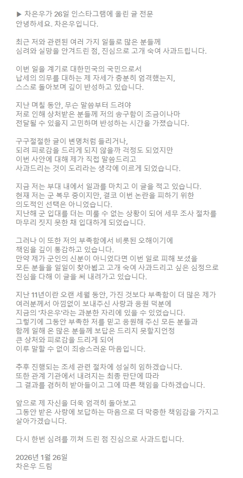 한편 차은우는 2025년 7월 육군 현역 입대, 현재 군악대 복무 중입니다.