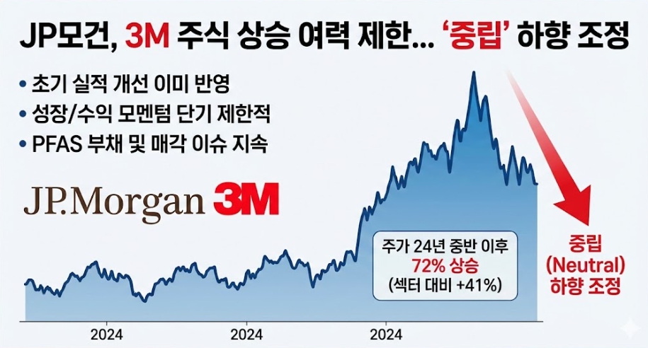 글로벌 투자은행 JP모건이 산업재 기업 3M에 대한 투자의견을 기존보다 낮춘 ‘중립(Neutral)’으로 조정했습니다.